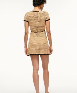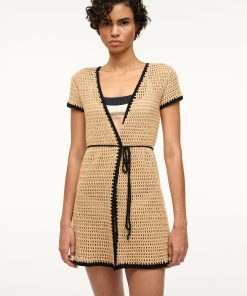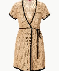 The Spritz is a wrap-style coverup mini dress with a v-neckline and long waist tie. It is crafted using an open square pointelle stitch and features a contrasting trim.