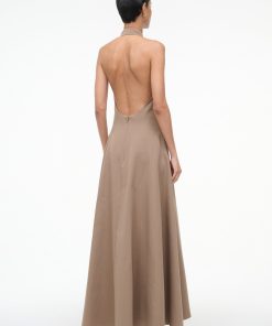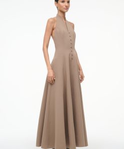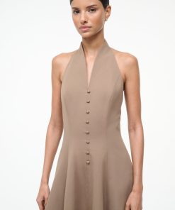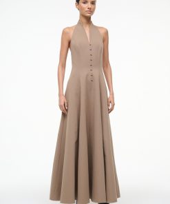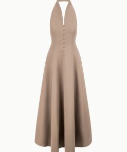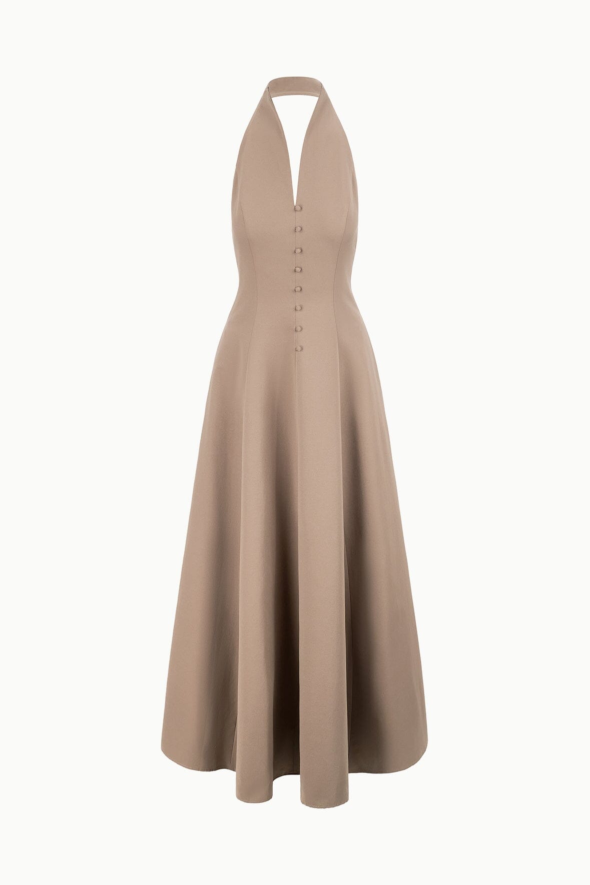 The Stella is a new occasion dress featuring a halter neckline, an open back, and button detailing down the front.