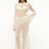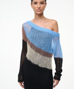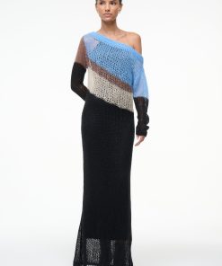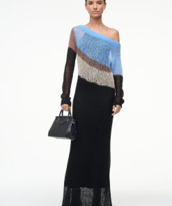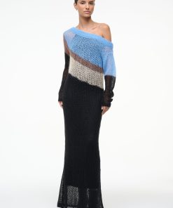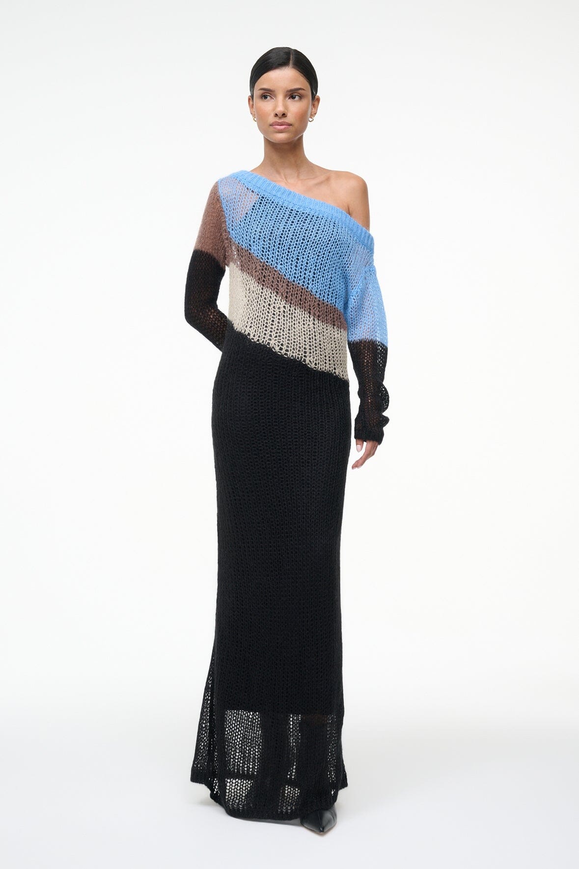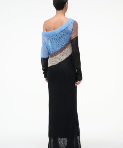 The Tessa Dress is an open stitch asymmetric off-the-shoulder knit dress in a mohair blend and comes with a jersey slip lining.