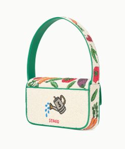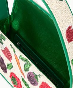 Fresh from the market, our seasonal Tommy bag features a farmers market crudite print. The Tommy Bag is a hand-beaded shoulder bag with vegan leather piping. This style features a single flap closure, inner zip pouch and a pocket on the back.