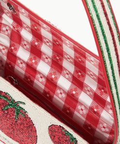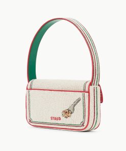 In celebration of The Summer of Staud, The Tommy Bag has been updated in a playful tomato print on the front and a spaghetti detail on the back. This style is hand beaded and features a single flap closure, inner zip pouch and has a pocket on the back.