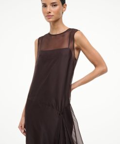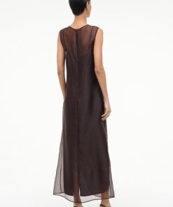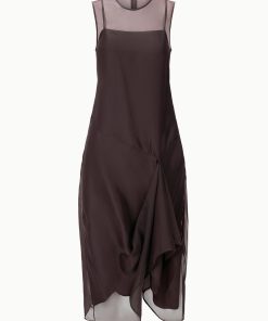 A sleeveless gown crafted from a delicate silk organza. The Viola Dress features a draped skirt which creates a dramatic asymmetrical hem and removable slip.