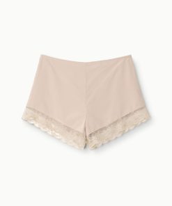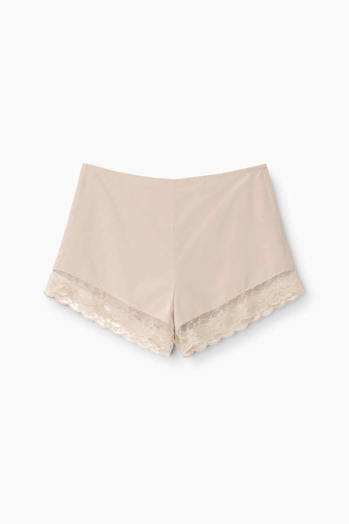 The Von Silk Short is a lightweight silk short with lace trim at the leg openings. This style matches with the Veronica Silk top as a matching set.