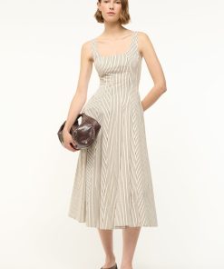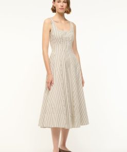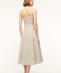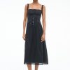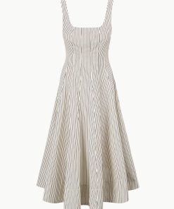 The Wells Dress has a square neckline and features a corset-inspired paneled bodice to create a flattering, fitted shape through the waist. It is made out of a lightweight cotton poplin and has a center back zipper.