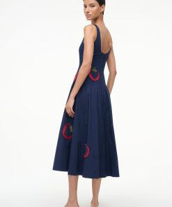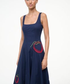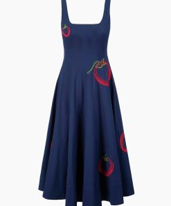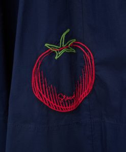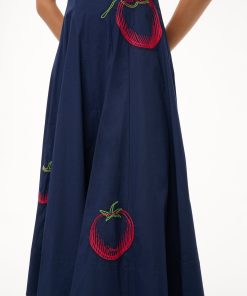 The Wells Dress has a square neckline and features a corset-inspired paneled bodice to create a flattering, fitted shape through the waist. It is made out of a lightweight cotton poplin and has a center back zipper. The Navy Roma Wells Dress has been updated with embroidery throughout the bodice and skirt in our seasonal tomato motif.