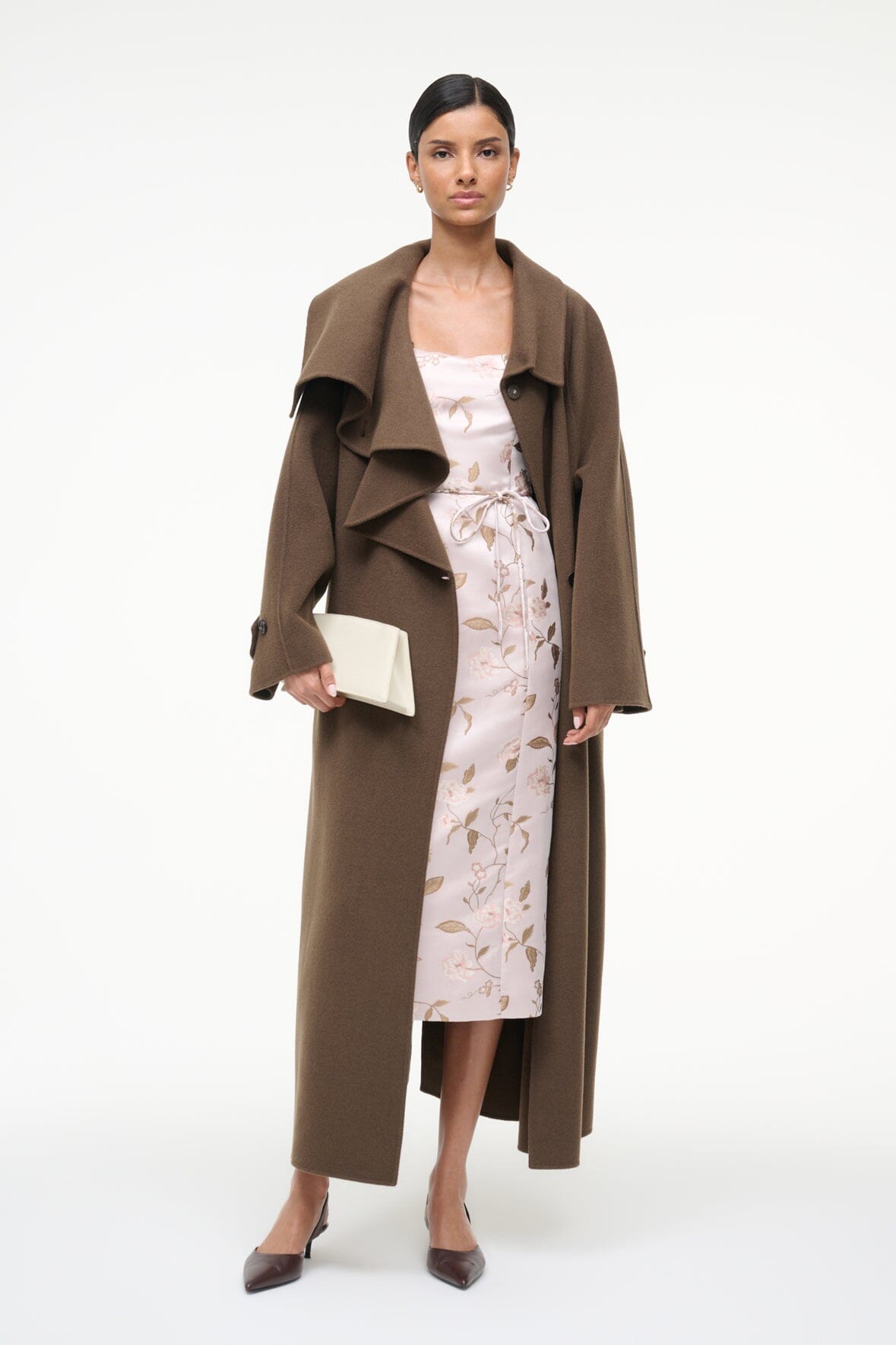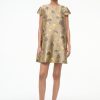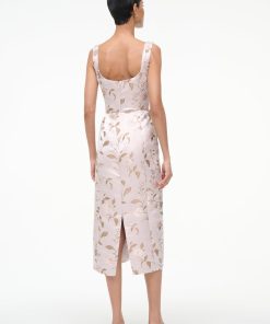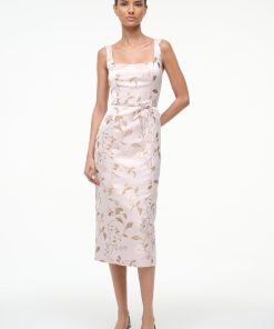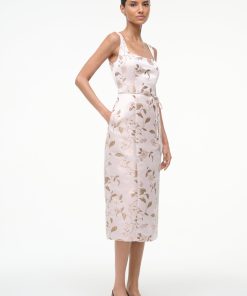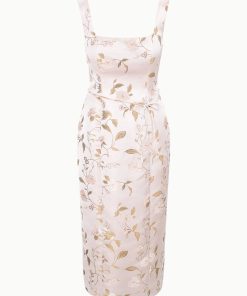 The Zoe Dress is a new floral brocade midi dress, featuring a fitted square neckline, a tie detail at the waist, and a tulip-shaped skirt.